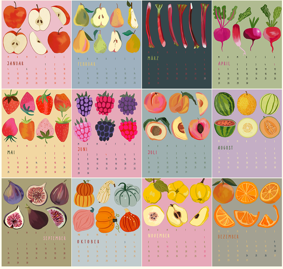 Dieser Küchenkalender ist aus meiner Freude an Farben, Essen und Illustration entstanden. Für jeden Monat habe ich Obst und Gemüse ausgewählt und illustriert, die den jeweiligen Zeitraum widerspiegeln. Mir war wichtig, alltägliche Lebensmittel nicht nur abzubilden, sondern sie lebendig, frisch und einladend wirken zu lassen. Ich habe mit leuchtenden Farben, verspielten Formen und vielen Details gearbeitet, um jeder Seite ihren eigenen Charakter zu geben. Entstanden sind alle Illustrationen digital in Procreate, meinem bevorzugten Tool für freie, intuitive Zeichenprozesse. Der Kalender ist als praktisches Objekt für die Küche gedacht – und gleichzeitig als farbenfroher Begleiter durch das Jahr.